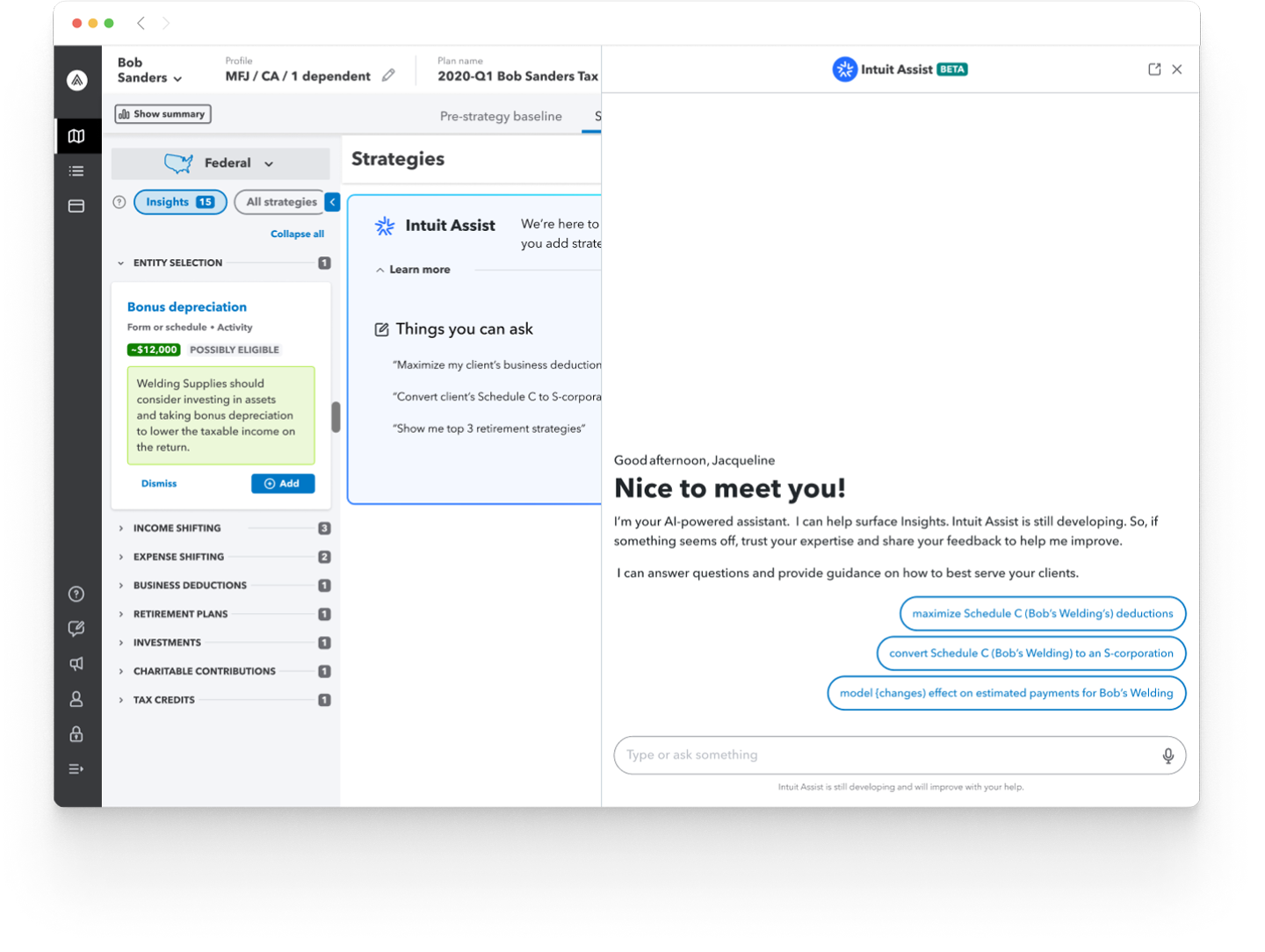 How might we leverage Intuit Assist (Intuit's GenAI-powered chatbot), an innovative and personable approach, to streamline the process of adding strategies to a client's plan, while also fostering enjoyable conversations?