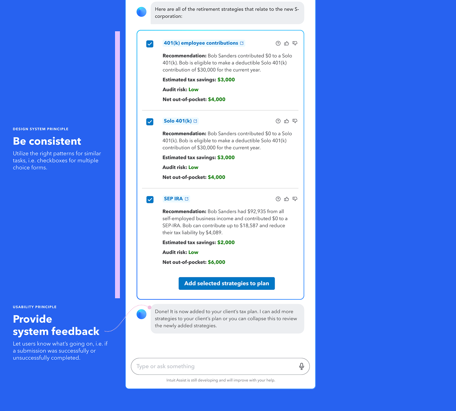 Within first month of launch, 50% of first-time users used Intuit Assist to add strategies to their client's tax plans and continued to purchase more credits, increasing conversion from 15% to 23%.